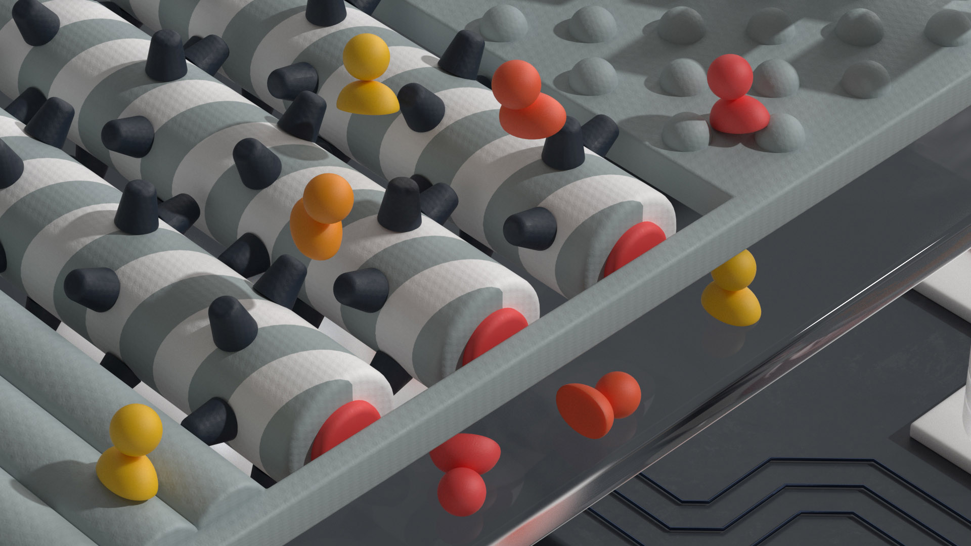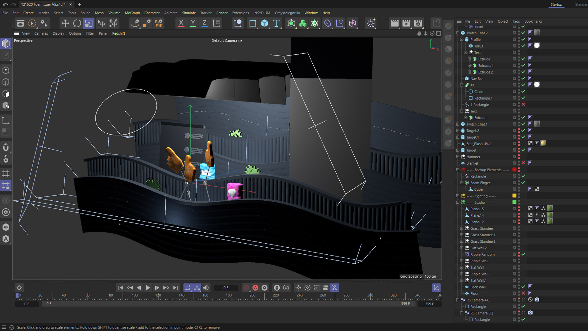 One of my other favorite pieces from the social posts was the super fans image. The concept sketches only featured robotic frames with foam fingers waving around. The brief also mentioned incorporating UI elements from Twitch (Amazon owns Twitch in case you didn't know like me at the time). In my mind, foam fingers and mid-west catholic church carnivals go hand-in-hand as I spent many days hitting up all the different venues for fun. The scene was perfect to model after the good old fashioned BB gun rifle shooter games. This of course is contrasted with the soft, foam, cushions. Walls are lined with foam pool noodles and the pillow prizes are modeled after Twitch's badges