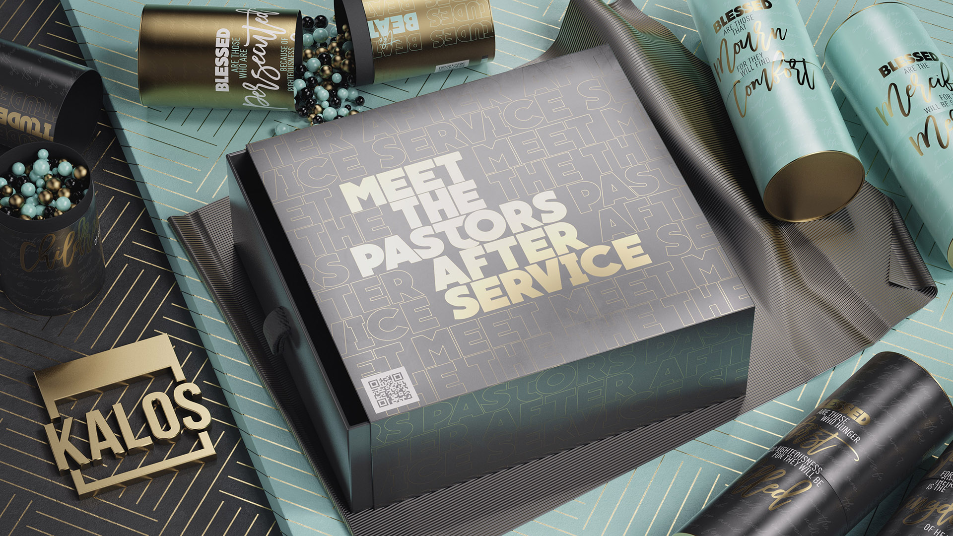 To make it relatable to a more masculine audience as well, I pulled inspiration from footwear packaging. Each box in the artwork has a little fabric pull tab with a printed cardboard sleeve. It's a subtle touch that helps bridge the gap between the male and female congregation at Kalos.