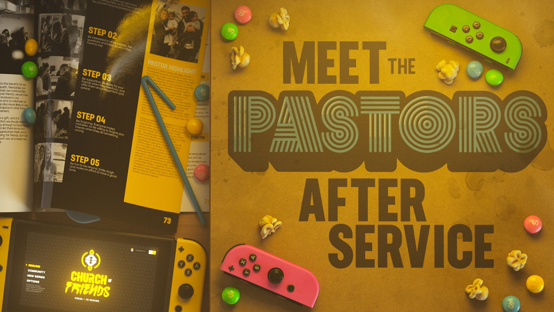 Lately I've been focusing on creating stories and environments that evoke a sense of nostalgia without needing specific imagery to drive those feelings. When I was tasked with designing the graphics for the sermon series "Church of Friends," I instantly wanted to call back to those late night gaming sessions of playing Mario 64 trying to beat Bowser at a friend's house. However, I wanted to update the setting so that the graphics didn't feel dated or overused.