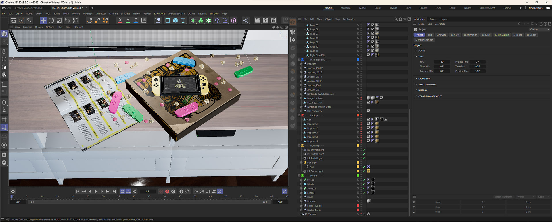 Creating these story prompts also help drive the cad models, textures, environment, and lighting for each scene. It can be easy to face decision fatigue trying to figure out what fits best in a scene, but a prompt can establish several of those details. The setting was a late night gaming session where most of the people had passed out on the couch or taken a quick break to grab more snacks.